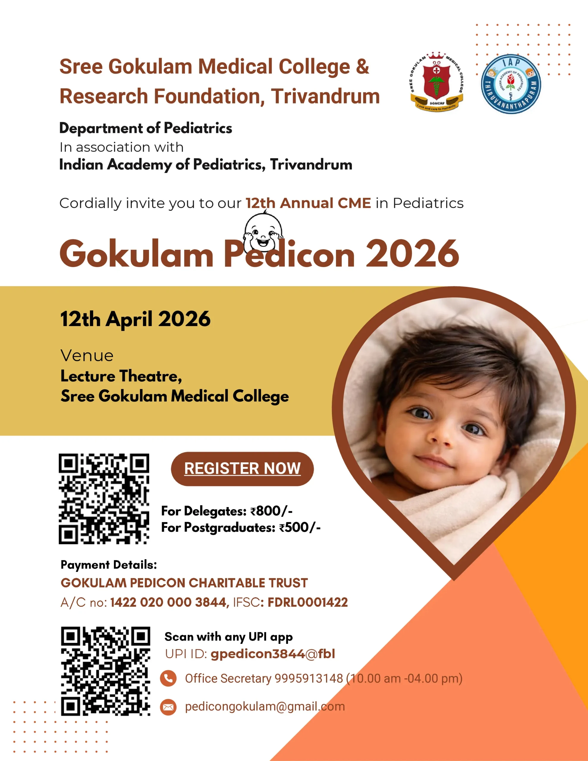 Sree Gokulam Medical CollegeGokulam Pedicon 202612th Annual CME in Pediatrics The Department of Pediatrics, Sree Gokulam Medical College & Research Foundation, Trivandrum, in association with the Indian Academy of Pediatrics (IAP), Trivandrum, cordially invites pediatricians, postgraduate students, and healthcare professionals to participate in Gokulam Pedicon 2026, the 12th Annual Continuing Medical Education (CME) program in Pediatrics. Date: 12 April 2026Venue: Lecture Theatre, Sree …